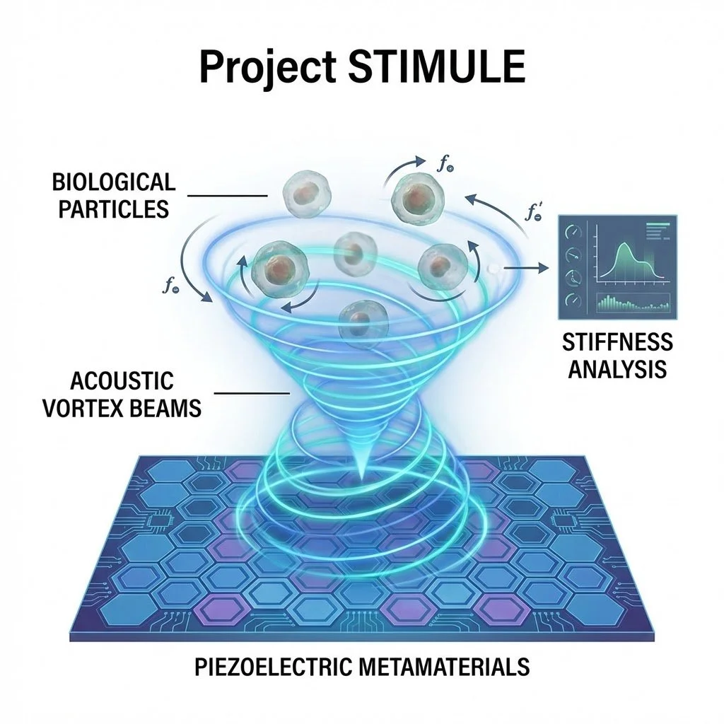 STIMULE develops an innovative acoustic platform that uses spatio-temporally modulated vortex beams and surface waves—generated via advanced piezoelectric metamaterials—to manipulate and analyze microscopic particles, with a focus on distinguishing cells based on stiffness. By precisely controlling acoustic angular momentum, the project enables contactless, label-free measurement of mechanical properties, offering high potential for biomedical applications such as cancer cell differentiation, diagnosis, and personalized medicine.